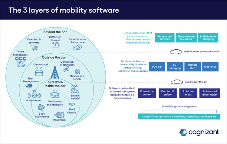 <p><span class="small">Figure 1</span></p> <p>Inside the car, an electric powertrain brings with it software controls for all related systems, as well as digital cockpits and semi- or fully autonomous driving.</p> <p>Connected systems are the bridge between the software inside and outside the car, enabling vehicle management and customization for consumers, as well as broader management capabilities for commercial fleets and the shared mobility sector.<br> </p> <p>And in a true ripple effect, the reach of software grows wider as it moves beyond the vehicle, affecting players in transportation-adjacent categories like insurance, urban planning, sustainability, advertising, health, and hospitality.<br> </p> <p>The software in each of these layers must be capable of interacting with various electrical components, mechanical components and sensors, all while maintaining data security and vehicle safety. This blend of requirements is highly specialized and industry-specific, creating a new domain for vehicle design and engineering. The need to manage this specialization, in one place and at scale, is pushing OEMs to broaden their ecosystems and demand more from players within those ecosystems.<br> </p> <h4>The rising software complexity challenge<br> </h4> <p>Today’s software-defined vehicles run over 100 million lines of code, which—not unlike smartphones—must be regularly updated.</p> <p>In vehicles, though, unlike smartphones, lives are at risk if an update is not properly written, tested and deployed. While consumer safety is a longstanding and mission-critical responsibility for OEMs, software-based systems drastically complicate this arena due to the volume and complexity of updates required.<br> </p> <p>Supporting and maintaining this ever-increasing amount of software is swiftly outpacing the ability to develop it, leading to a skill and talent shortage within OEMs and their Tier One suppliers.<br> </p> <p>Why is this complexity growing at such an exponential rate? Because mobility software is never used in a silo. There is an ecosystem of processes and parties involved:</p> <ul> <li><b>Integrated testing and validation. </b>Testing must occur for all possible variations of vehicle make, model, year and trim to ensure updates are performing with the minimum speed and efficiency on the software and hardware level. After all, software provides the command, but hardware will embody the result.<br> <br> Testing must not only verify that the fix the update was written for is working properly among all possible vehicle variations; it must also ensure all unrelated operations function the same way after the update as they did before. Everything from safety lights, to alerts in the dashboard, to sensors for detecting crashes and deploying air bags must be addressed. Dedicated laboratories for this kind of hardware-in-loop testing are essential, particularly for sophisticated use cases such as <a href="https://en.wikipedia.org/wiki/Advanced\_driver-assistance\_system" target="_blank" rel="noopener noreferrer">advanced driver assistance systems</a> and telematics.<br> <br> Equally important is the need to maintain an audit trail of updates. Traceability of what features or changes are introduced by which update, and whether any issues subsequently arise, is necessary for compliance, as well as consumer protection and trust.<br> <br> </li> <li><b>Connected solutions. </b>Connected solutions introduce third parties into the software mix and, along with them, more requirements. Fleet solutions are a prime example. Operators want to know which vehicles are in which location, who is using them, at what speed, their fuel consumption, maintenance issues, and maintenance predictions. All this data must be aggregated and visualized into a dashboard, and each software update must maintain compatibility with such systems.<br> <br> Insurance is another complex case using tools like onboard diagnostic trackers and mobile digital video recording to determine policy pricing and collect first notification of loss. On the consumer side, new apps and parties are continuously arising—charging stations, in-vehicle entertainment, innovative navigation solutions to balance traffic flows, and more.<br> <br> With connected solutions rising in number and complexity, automakers should invest in a custom connected car platform to manage communications, E/E development for in-vehicle functions, and bespoke applications for user experience.<br> <br> </li> <li><b>Digital and data security. </b>Over time, automakers have relied on many disparate subsystems to achieve a fully operational software-defined vehicle. This creates myriad issues for code development and deployment, and also for security and compliance. Each new system, exchange, and connection creates millions of lines of code to test, debug and secure against cyberattacks. OEMs that are not running an end-to-end software management platform are increasing their risk for data exposure, as well as their workload.<br> </li> </ul> <p>It’s clear why product lifecycle management for vehicles has never been more complex. With new vehicles being produced annually and needs for updates arising daily, finding a methodical way to support the development, testing, verification and traceability of these updates is mission-critical.<br> </p> <h4>Scaling an automotive software enterprise<b></b></h4> <p>To address the complexity of the new automotive era, automakers must balance innovation, risk and reality. Their institutional knowledge and industry experience fosters a strong competitive mindset, but software expertise is required to bring these innovative ideas to life, monetize them, and safely manage them in a landscape where lives and data security are on the line every time a vehicle is on the road. OEMs must work with a wider ecosystem of partners, curated for their ability to complement existing talent and enable new business models.<br> </p> <p>The challenges 