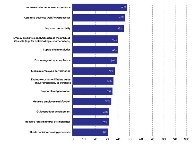 <p><span class="small">Response base: 250 senior insurance executives<br> Source: Economist Impact Survey 2022<br> Figure 2</span></p> <h5><span style="font-weight: normal;">Long way to go</span></h5> <ul> <li><b>New business generation and retention</b>. Just slightly above half of insurers believe tech adoption is significantly benefitting new business generation or retention. This falls well short of data’s potential. Since sales often run through the app or website of a digital retailer, a critical step to maximize this is for insurers to build out an API layer that smoothly integrates their systems with those of these retailers.</li> </ul> <h5><span style="font-weight: normal;">The importance of bridging the gap</span></h5> <ul> <li><b>Being embedded in tech ecosystems is critical to driving future value</b>. Insurers need to be well embedded in dynamic ecosystems through economical API solutions—for example, in partnership with innovative distribution startups.<br> <br> </li> <li><b>Commercial adjacencies and market opportunities emerge through ecosystems. </b>Post-sale relationships with clients can now become ongoing conversations that benefit all sides. For example, subject to customers’ consent, health insurers can use digital channels to nudge them to exercise more and eat healthier food—and then offer lower premiums to those with healthier habits.</li> </ul> <h4>From cognitive customer service to prescient product development</h4> <h5><span style="font-weight: normal;">What they’re good at</span></h5> <ul> <li><b>Customer experience</b>. Advances in technology, best practice adoption across industries, and an emphasis on journey-based engineering have been driving significant experience improvements in insurance. The movement to first understand the human-centric reality of business processes has opened transformational uses of conversational AI, natural language processing, and systems that interact with clients based on underlying emotions. For industry leaders, cognitive systems guide chatbots to respond to customers and escalate work to upskilled agents when tense situations need specialized, human-driven handling. The result is higher customer retention rates, lower agent turnover and the generation of insights to continuously improve customer experience.<br> <br> </li> <li><b>Workflow. </b>New workflows are being put in place so that the most predictable, rote and repetitive activities are handed off to software, while humans specialize in using judgment, creativity and language. Over time, intelligent process automation will improve and will continue to drive engagement specificity where the human touch is needed. </li> </ul> <h4>But insurers are not leveraging data optimally</h4> <p><i>Respondents were asked for which reasons their company is leveraging data. (Percent of respondents who selected each reason)</i><br> </p>