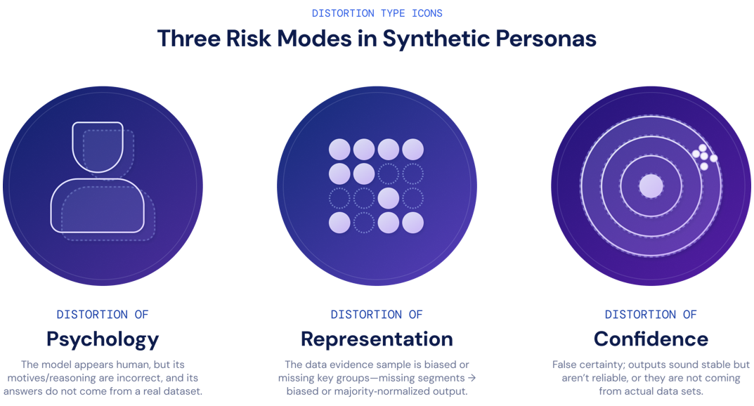 Research shows that using synthetic personas can support experimentation and help companies close gaps in decision-making. However, to confirm the quality of these outcomes, we must ask: under what constraints can these studies remain valid decision-support tools rather than become persuasive fiction? Below are the three most common failure modes arising from synthetic consumer simulations.