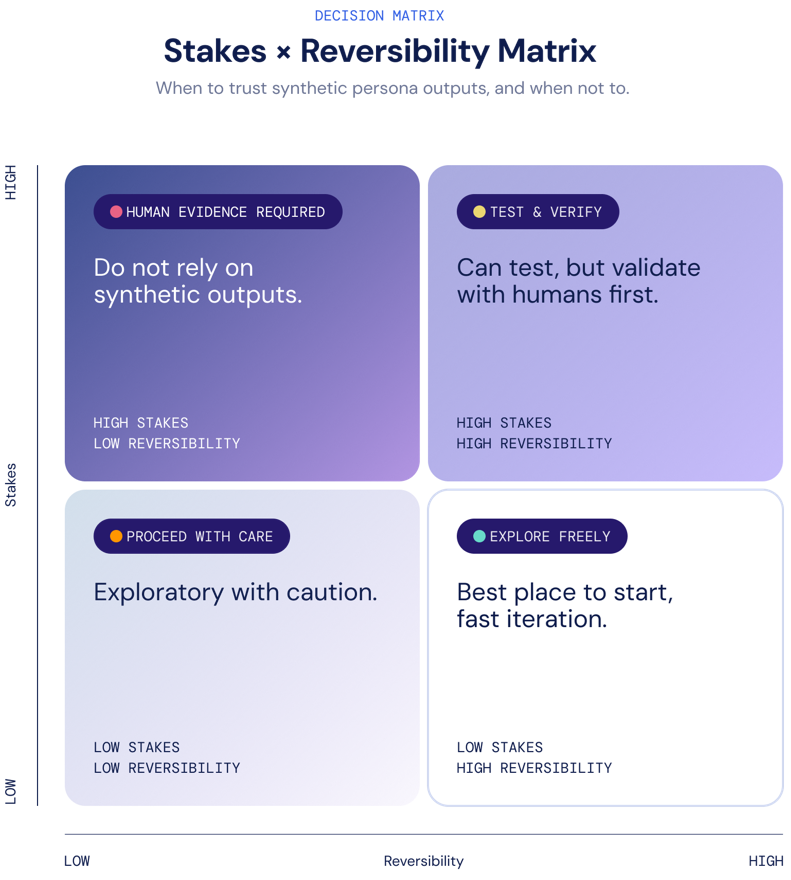 However, the speed, flexibility, and creative space that synthetic simulations deliver in research could create serious risks. Synthetic research simulations can produce convincing user stories but may overlook empirical consumer data and experience, especially when they lack explicit governance controls. All of those could lead to deficits and unreliable research outcomes.
