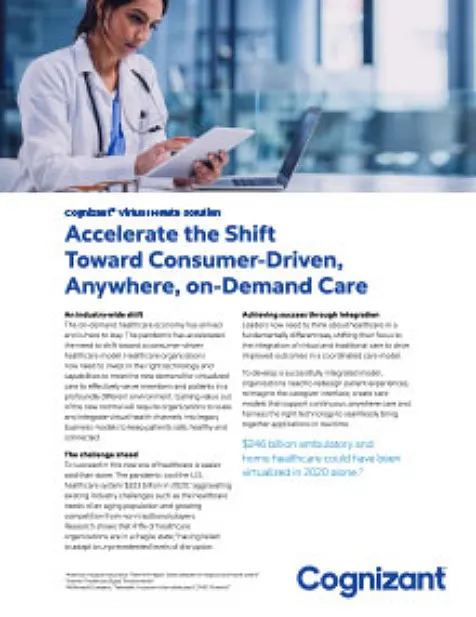 <h3>Accelerate the shift toward customer-driven, anywhere, on-demand care.</h3> <h5>Today, better care comes through the successful integration of virtual health and traditional care. As a result, organizations must strive to deliver seamless care experiences from hospital to home. This requires leaders to approach technology from a consumer-first angle, break down silos and push for overarching integration of virtual health.</h5> <h5>Cognizant is ready to help organizations address the shift to virtual health with solutions that can be deployed separately or in combination for comprehensive and seamless virtualization. We provide healthcare organizations with consulting, operations and technology services to help launch, scale or enhance virtual health.</h5> <h5>Learn more about our <a href="https://www.cognizant.com/us/en/industries/healthcare-technology-solutions" target="_self" rel="noopener noreferrer" previewlistener="true">Healthcare</a> solutions for your business.</h5>