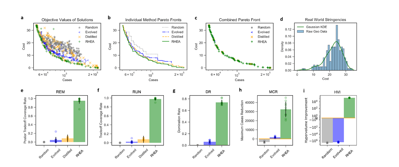 RHEA analyzed the 169 model submissions, distilling their strategies into neural networks and evolving them to find optimized solutions. The resulting strategies achieved superior tradeoffs between reducing case numbers and minimizing intervention stringency, surpassing both standalone AI models and individual expert contributions. Notably, some contributions that initially appeared low-performing ended up making outsized contributions to the final optimized set of solutions: RHEA unlocks their latent potential.