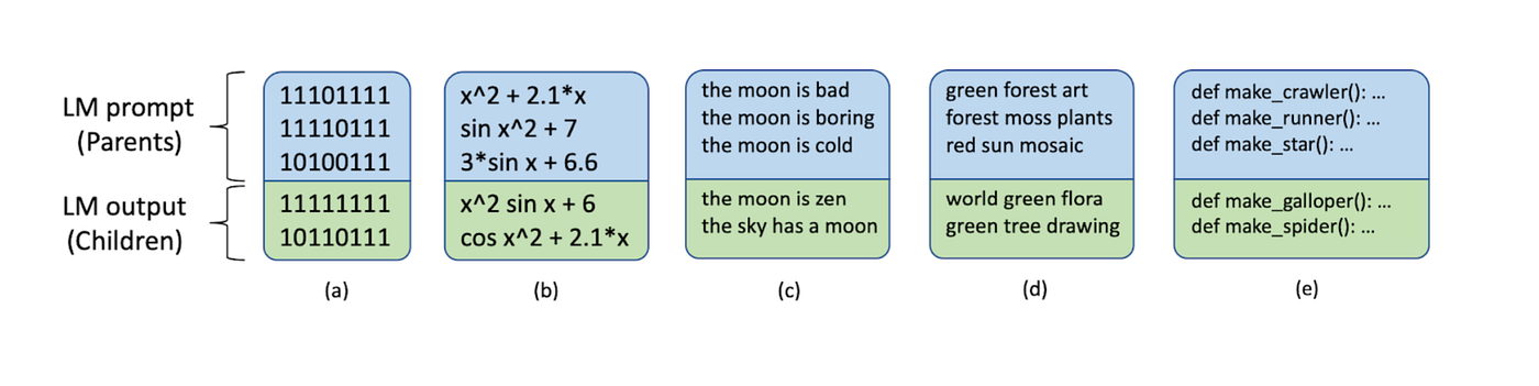 Language Model Crossover (LMX) emerges as a compelling solution to this challenge. By leveraging large language models (LLMs), LMX transforms the problem of designing domain-specific operators into a generalizable process of using few-shot prompting. This approach allows LMX to recombine text-based genotypes — such as code, equations, and natural language — into high-quality offspring with minimal domain-specific tuning. Through its inherent adaptability, LMX enables evolutionary algorithms to scale across domains with unprecedented ease.