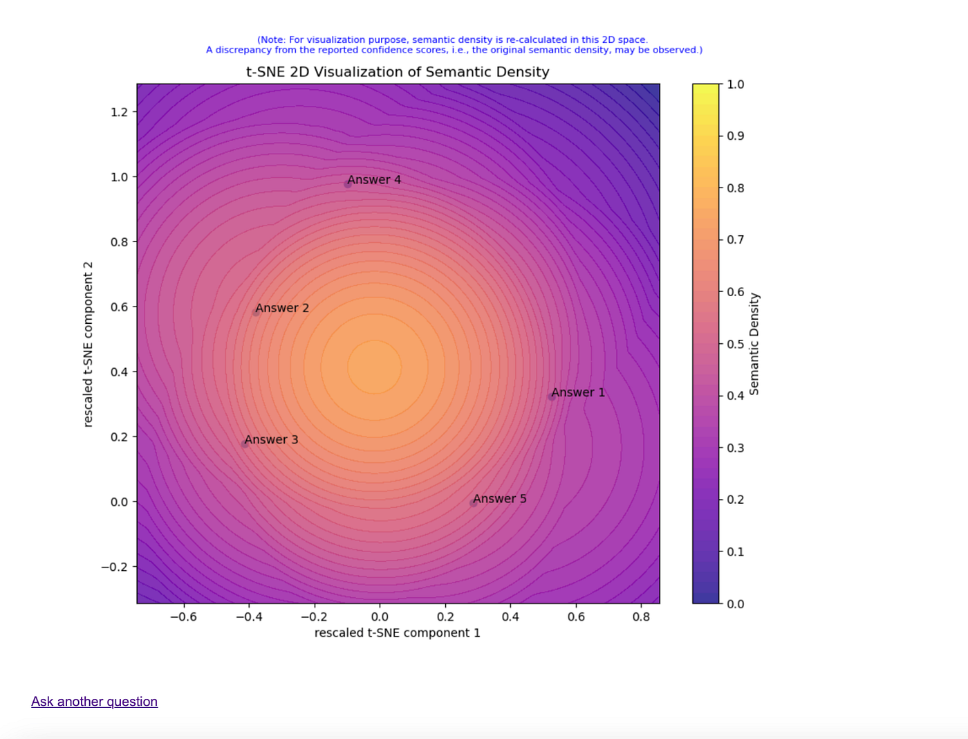 3. A 2D visualization shows how the responses cluster in semantic space. Proximity reflects semantic similarity; the heatmap indicates areas of higher density. (Note: The 2D plot is for interpretation only. Semantic density is calculated in a higher-dimensional space, so the numerical confidence score is the most accurate signal.)