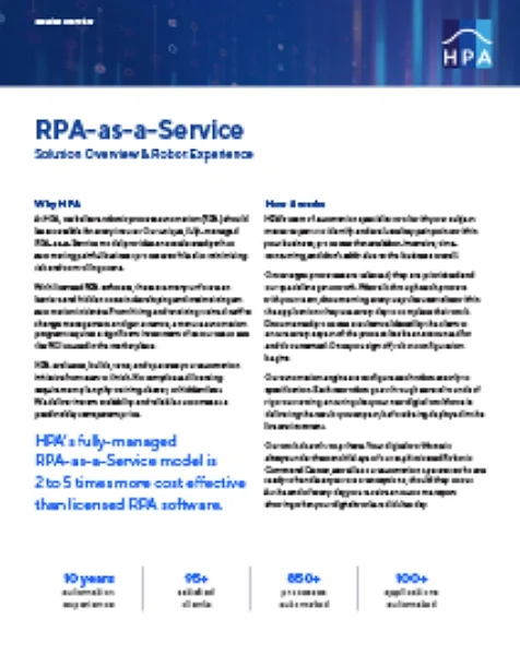 <h3><span class="text-regular">Scale to meet operational demands—without increasing operational costs.</span></h3> <h5>RPA-as-a-Service allows insurers to adapt to new demands with a level of flexibility and operational predictability that is difficult to achieve with a human workforce alone. For tasks that are labor-intensive or time-consuming, robots serve as a new digital workforce, yielding greater levels of consistency and accuracy than can be achieved with manual effort.</h5> <h5>HPA, a Cognizant company, is the leading RPA-as-a-Service provider for insurers seeking secure, reliable intelligent automation solutions. As a proven automation center of excellence, HPA uses proprietary technology and an extensive reusable code library to deliver scalable RPA programs that accelerate ROI and reduce total cost of ownership.</h5>