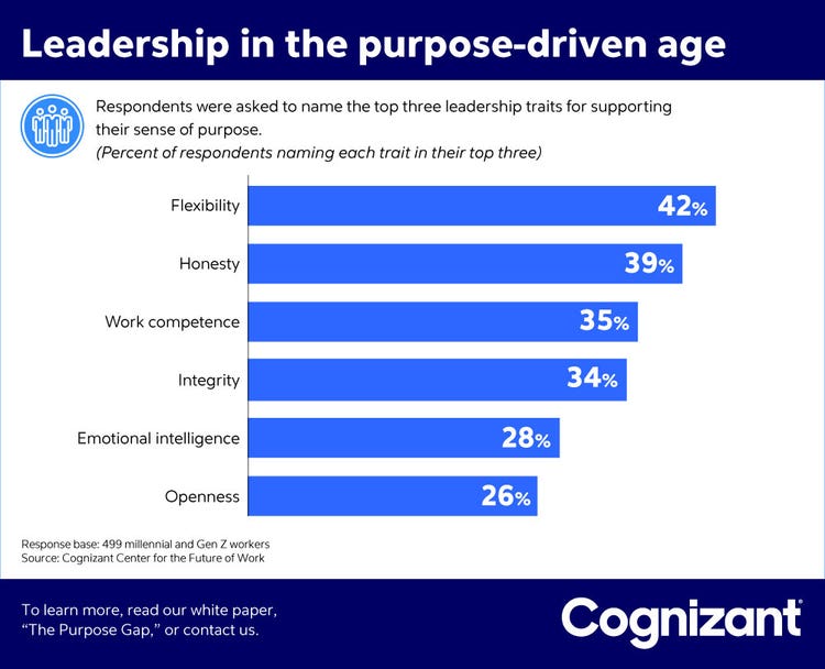 <p><br> While it’s logical for employees to value flexibility after almost two years of responding to pandemic-imposed needs, this trait may still not come as naturally to leaders themselves. When that is the case, leadership training may be necessary.</p> <p>In addition, leaders need to:</p> <ul> <li><b>Be the change employees want to see in the world.</b> Workers will have little reason to doubt the authenticity of the company’s commitment to positive outcomes beyond the bottom line if they see leaders rolling up their sleeves to directly take part in promoting positive social and environmental outcomes. Kate Isaacs, an MIT lecturer who has spent years researching business-led ventures with social impact, <a href="https://sloanreview.mit.edu/article/how-corporate-clout-helps-communities-thrive/" target="_blank" rel="noopener noreferrer">has identified</a> the ability to tell a clear and purposeful story and to combine institutional goals with community priorities as some of the common elements of effective leaders.<br> <br> </li> <li><b>Learn to be a follower.</b> Leading doesn’t mean having all the answers. No one is all-knowing, and young workers struggle to take seriously leaders who pretend they are. Understanding how and when to learn from others, notably from younger workers, is an essential part of being a good leader. It not only helps build a better company by inviting more diverse views on how and where to steer the business, it assures young workers they’re being heard. Reverse mentoring is a key way of accomplishing this. The current rate of social change has made it even more important for leaders — especially those with long tenures at the same company — to listen to those who are less embedded in the organization’s culture and retain strong connections with the outside world. That normally means younger workers. Reverse mentoring can also be valuable when it encourages relationships between people at different career levels.</li> </ul> <p><i>To learn more, read our White Paper, “</i><a href="/content/dam/connectedassets/cognizant-global-marketing/marketing-channels/cognizant-dotcom/en_us/insights/documents/the-purpose-gap-codex7086.pdf" target="_blank" rel="noopener noreferrer"><i>The Purpose Gap</i></a><i>” or </i><a href="/content/cognizant-dot-com/us/en/about-cognizant/contact-us.html" target="_blank" rel="noopener noreferrer"><i>contact us</i></a><i>.</i></p>